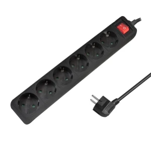 6x safety sockets, With illuminated ON/OFF switch, Outlets in 45° position, Sockets with safety shutter, IP20: Protection against the penetration of solid objects >12.5 mm and contact with fingers, Angled safety plug, Power: 230 V/16 A, 50 Hz, max. 3500 W, Cable length: 1.5 m, Color: Black