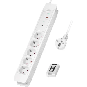 Power: 230 V/16 A, 50 Hz, max. 3680 W – Cable specification: H05VV-F 3G 1.5 mm² – Cable length: 1.5 m – Colour: White, 5 x earthing contact sockets – control of the power strip via remote control, up to 20 m distance, Control up to 2 power strips with the remote control (the second is not included), With surge protection.