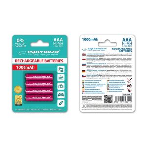 Rechargeable batteries Esperanza combine the latest technology of modern nickel metal hydride rechargeable batteries with the advantages of conventional alkaline batteries and replace them perfectly. At the same time they affect less pollution of the environment and allow to achieve significant financial savings. By optimizing cell technology with the ability to load and use in the production of high-quality components has minimized the effect of self-discharge. Rechargeable batteries Esperanza after one year holds 85% of its nominal capacity., Technical Data:, Capacity: 2000 mAh, Voltage: 1.2 V, Size: AAA (HR6), Type: Ni-MH, Number of charging cycles: about 1000 times, Loading without memory effect, Environmentally friendly: 1 battery = 1000 disposable batteries, A small self-discharge, They can be charged in all chargers designed for charging rechargeable Ni-MH batteries