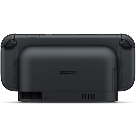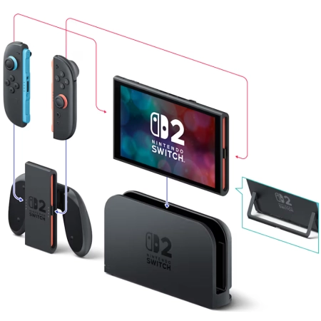 Screen: Capacitive touch screen, 7.9-inch wide color gamut LCD screen, 1920×1080 pixels, HDR10 support, VRR up to 120 Hz, CPU/GPU: Custom processor made by NVIDIA, Storage: 256 GB (UFS), Communication features: Wireless LAN (Wi-Fi 6), Bluetooth, In TV mode, Nintendo Switch 2 can be connected using the wired LAN port on the dock, Video output: Output via HDMI connector in TV mode, Maximum of 3840×2160 (4K) resolution at 60 fps (TV mode), Supports 120 fps when 1920×1080/2560×1440 resolutions are selected, Supports HDR10, *Maximum 1920×1080 resolution in tabletop mode and handheld mode, following screen resolution, 2x USB-C connectors: The port on the bottom is used to charge the console and connect to the Nintendo Switch 2 dock. The port on the top is used to connect accessories and/or charge the console, 3.5mm 4-contact stereo mini-plug, Both Nintendo Switch 2 and Nintendo Switch game cards can be inserted, Compatible with microSD Express cards only (up to 2 TB), Accelerometer, gyroscope, and mouse sensor located in Joy-Con 2 controllers, Brightness sensor located in console, Internal battery: Lithium-ion battery/5220mAh, Battery life: Approx. 2 – 6.5 hours, Charging time: Approximately 3 hours.