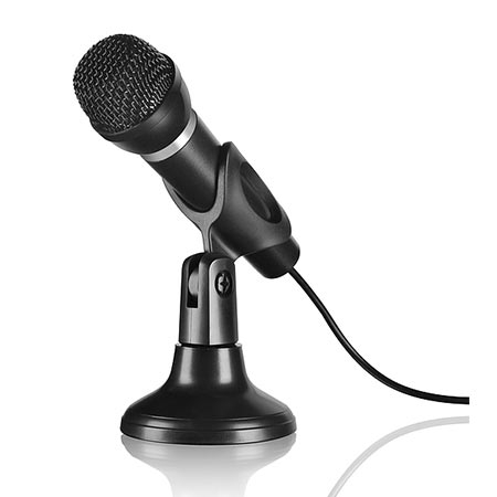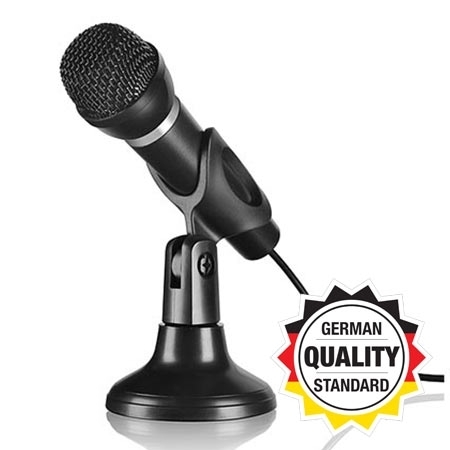 Handheld PC mic, excellent recording quality for speech and singing, ideal for brilliantly clear voice recordings, ergonomic and lightweight, practical stand for secure positioning and microphone angle adjustment, handy on/off switch for quick muting, robust construction, easy to install, 3.5mm jack plug, 2m cable for lots of freedom