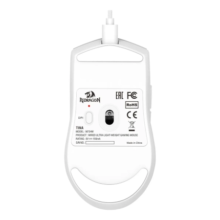 Wired USB-C to USB-A, Switch Huano Blue Shell Blue Dot, DPI 50-12400, Sensor Pixart 3327, Response 125 / 1000 Hz, Symmetrical, Buttons 5, DPI button on the bottom, Programmable Buttons, Ergonomic Natural Grip Build, Weight: 42 g, Cable: Paracord, Color White