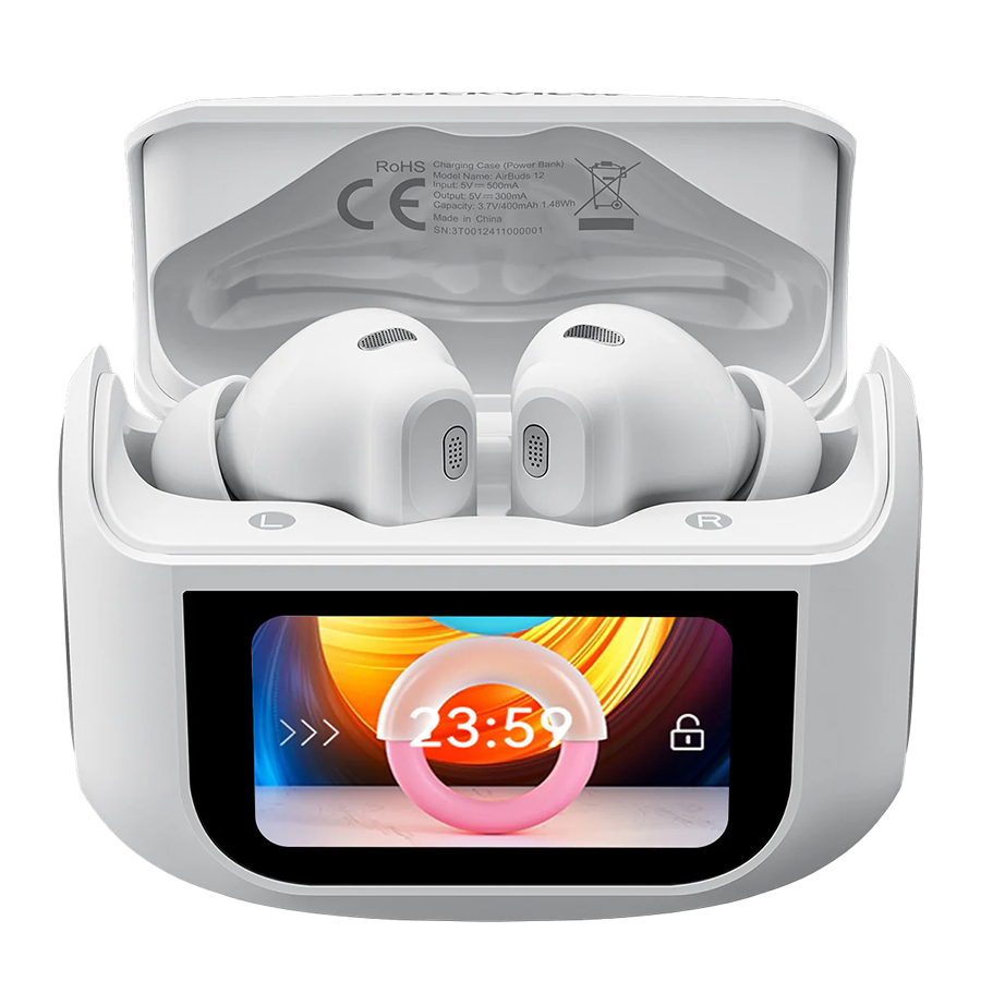 Screen: 1.47inch, • Bluetooth version: Bluetooth 5.4, • Distance: 10m, • Earphone battery: 35mAh, • Charging box battery: 400mAh, • Earphone Dimensions: 32.02*20.63*22.94mm, • Charging box Dimensions: 59.91*48.27*27.79mm