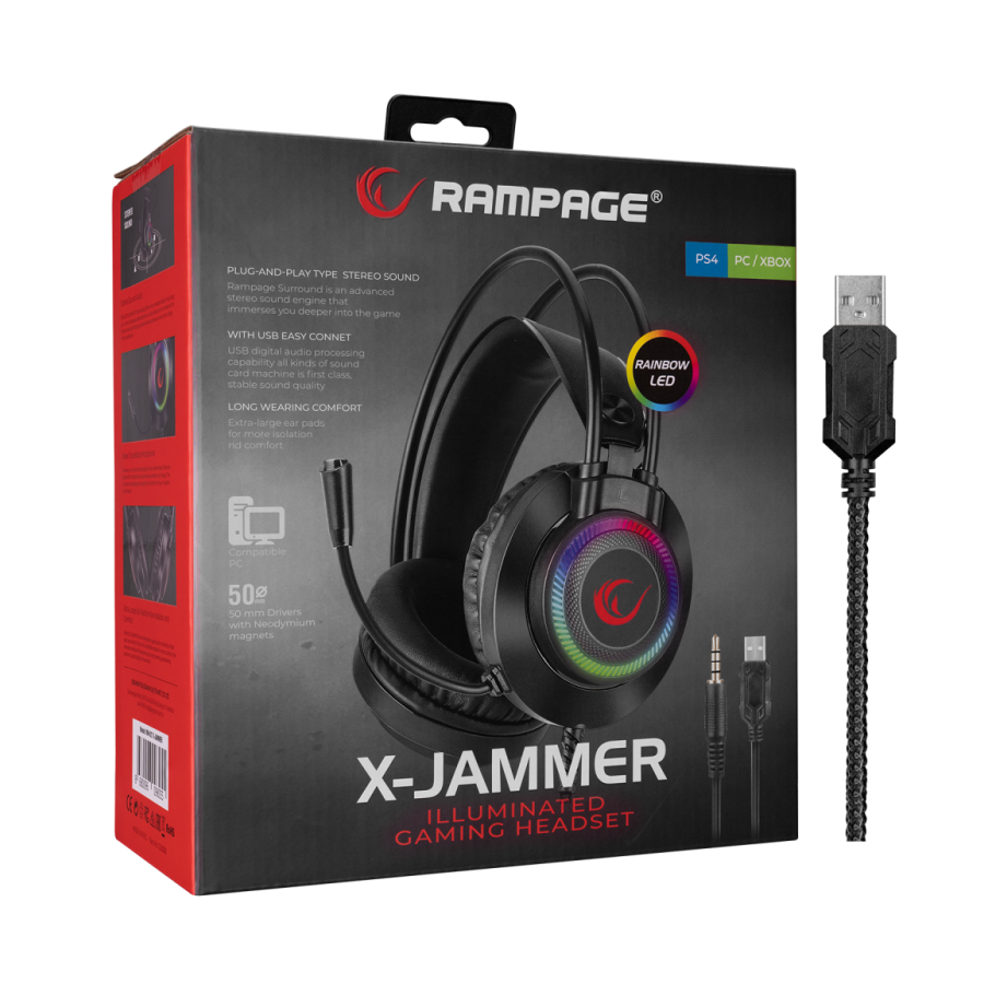 Slušalice sa mikrofonom gaming RAMPAGE RM-K27 X-JAMMER Rainbow RGB LED USB 3.5M PC – PS4-PS5-XBOX, 34516
