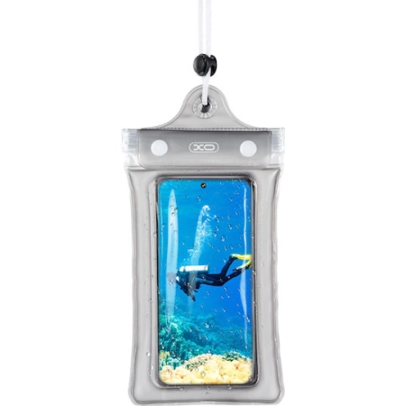 XO-KT03 Case Waterproof PVC Bag for Mobile Phones. Inflatable model with zipper and cord, suitable for phones up to 7 inches. Material: 0.25 PVC (inflatable edge), Size: 10 x 23 cm, Waterproof: iPX8, Applicable: under 7 inches, Closure: Closure with three zippers.