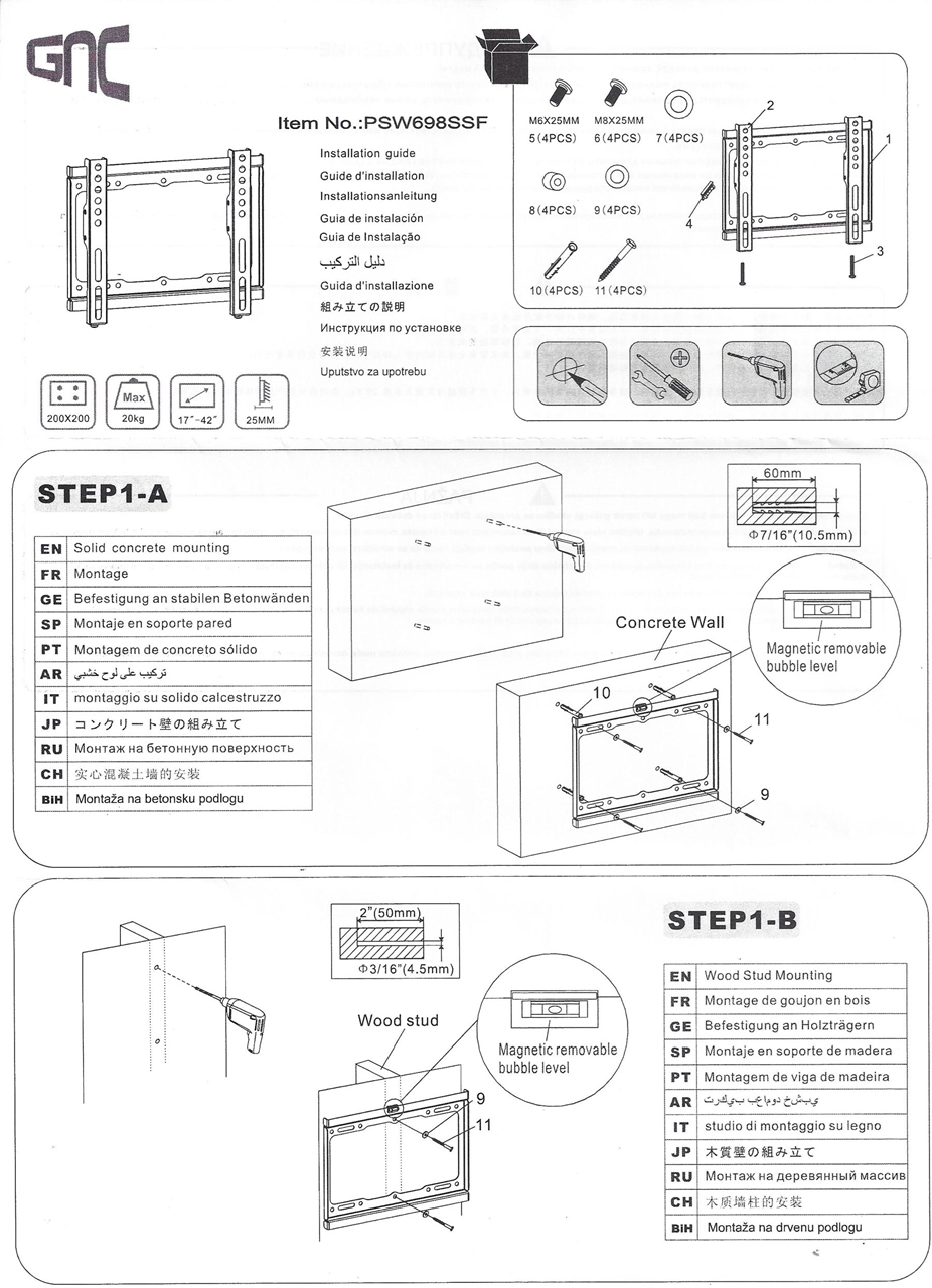 Zidni nosač GNC PSW698SSF 17″-43″, 20kg, VESA 200×200, FIXED